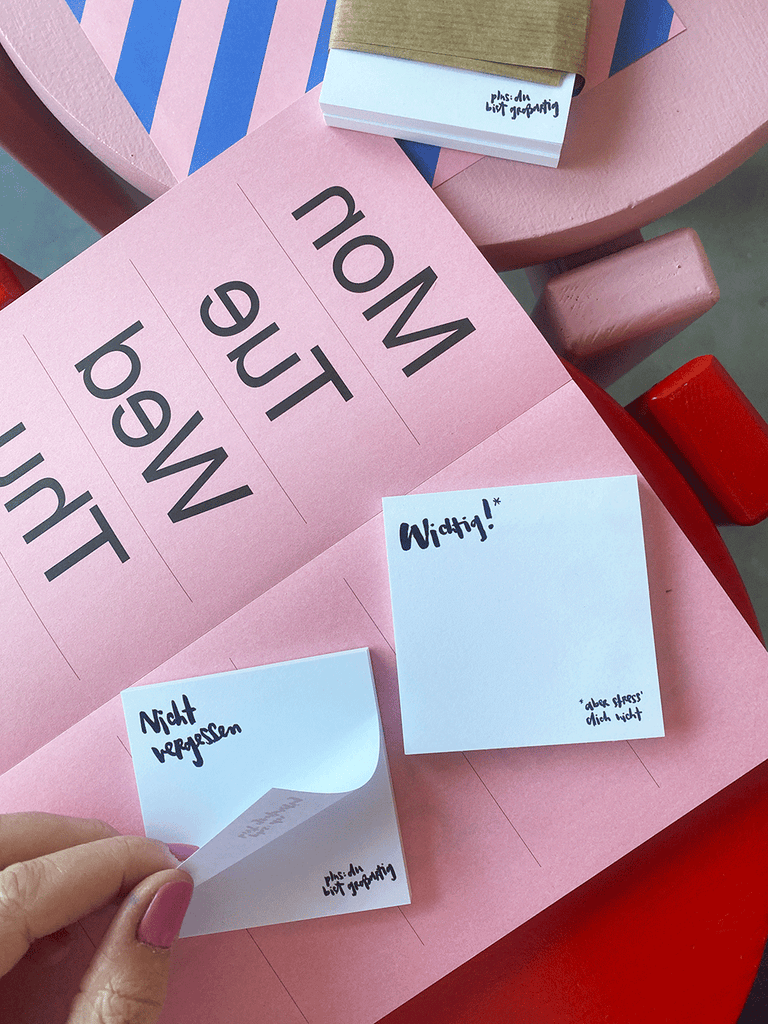 Haftnotizen "Nicht vergessen (plus: du bist großartig)" und "Wichtig! (aber stress' dich nicht!" im 2er Set