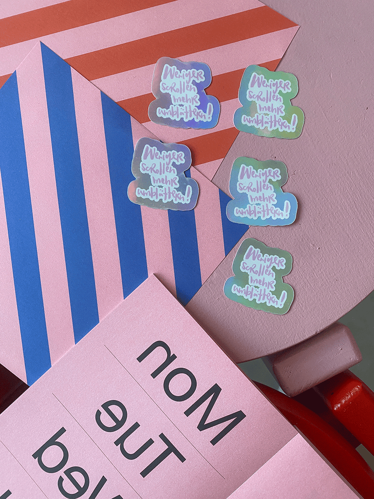 Rosa Farben, ein holographischer Effekt und ein Knaller-Lettering treffen sich zu einem ganz besonderen Sticker für Menschen, die gerne Lesen oder es mehr tun wollen": "Weniger scrollen, mehr umblättern". Klebt sie auf einen (Liebes-)Brief an die beste Freundin, ins Journal oder Schulmappen der Kids oder verschönert eure Handyhülle und oder Laptop damit. Mega!